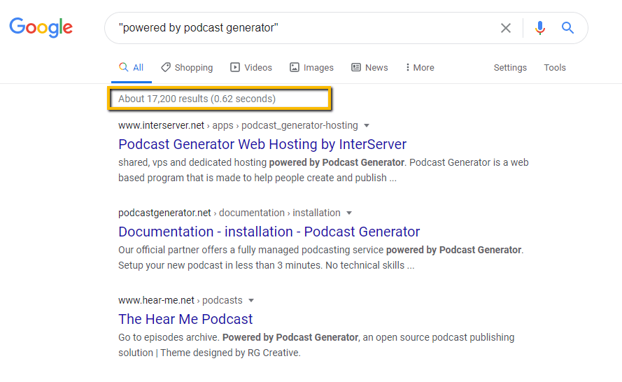 A search for the exact string "Powered by Podcast Generator" (the default footer of every installation) returned approximately 17,200 results on Google in January 2021. While this may be inflated by multiple indexed pages per installation, it also misses sites that removed or customised the footer, and sites no longer indexed at that specific point in time.