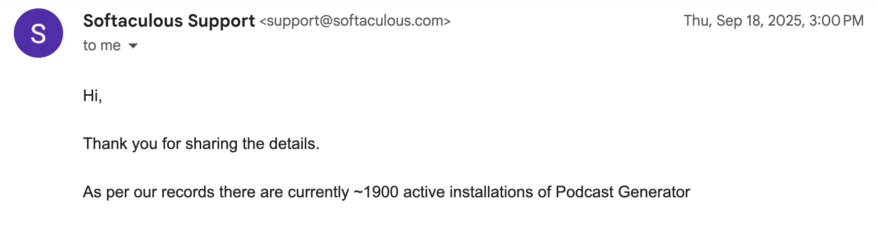 When contacted in September 2025, Softaculous confirmed approximately 1,900 active installations on their platform. A research we conducted on 2 April 2026 on the Podcast Index data dump found 3,281 RSS feeds generated by Podcast Generator and still present in the index.